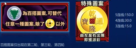 當盤面出現三個或三個以上的「乾隆通寶」(Scatter Symbol並達成連線條件 時,即可進人免費遊戲。